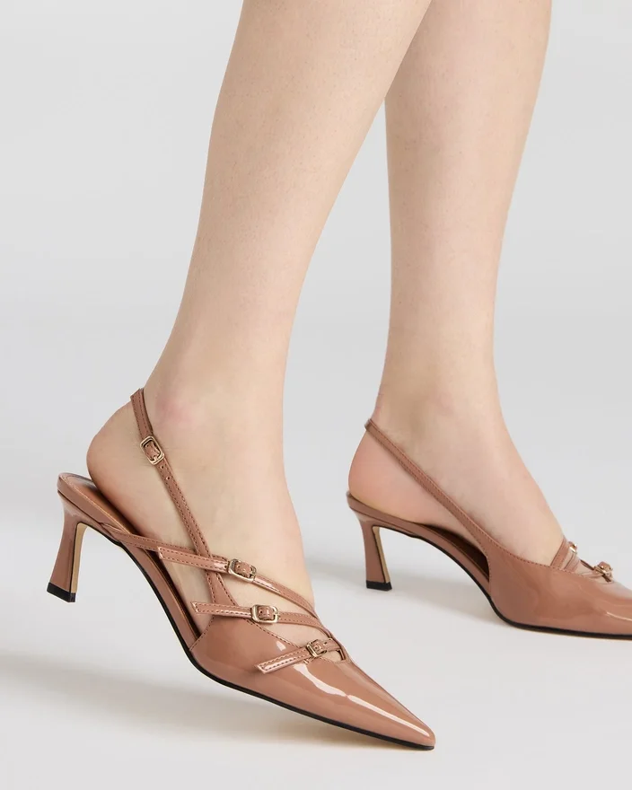 Unn deg luksus med Liana Slingback. Med sin lave hæl og spisse tå utstråler denne skoen eleganse. Designet med stropper foran gir et sofistikert preg, mens det lakkerte materialet løfter det generelle utseendet.