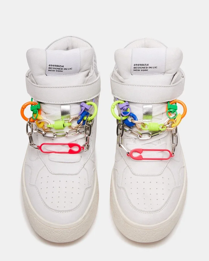 Emilee-sneakersene har en polstret krage og flatform-såle for en solid, strukturert silhuett. Et utvalg av muntert uensartede charms og kjeder fremhever snørebåndene og gir et fargerikt innslag.