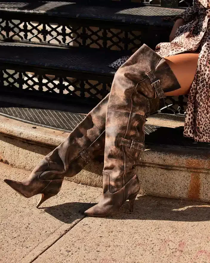 Baddie-støvletterne er fagmessig laget og er både edgy og praktiske. Disse overkneestøvletterne med høyhælte sko er laget med spiss tå og spennedetaljer, og gir et unikt preg til ethvert antrekk. Løft stilen din med disse iøynefallende støvletterne.