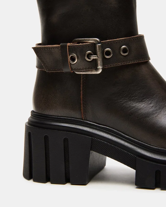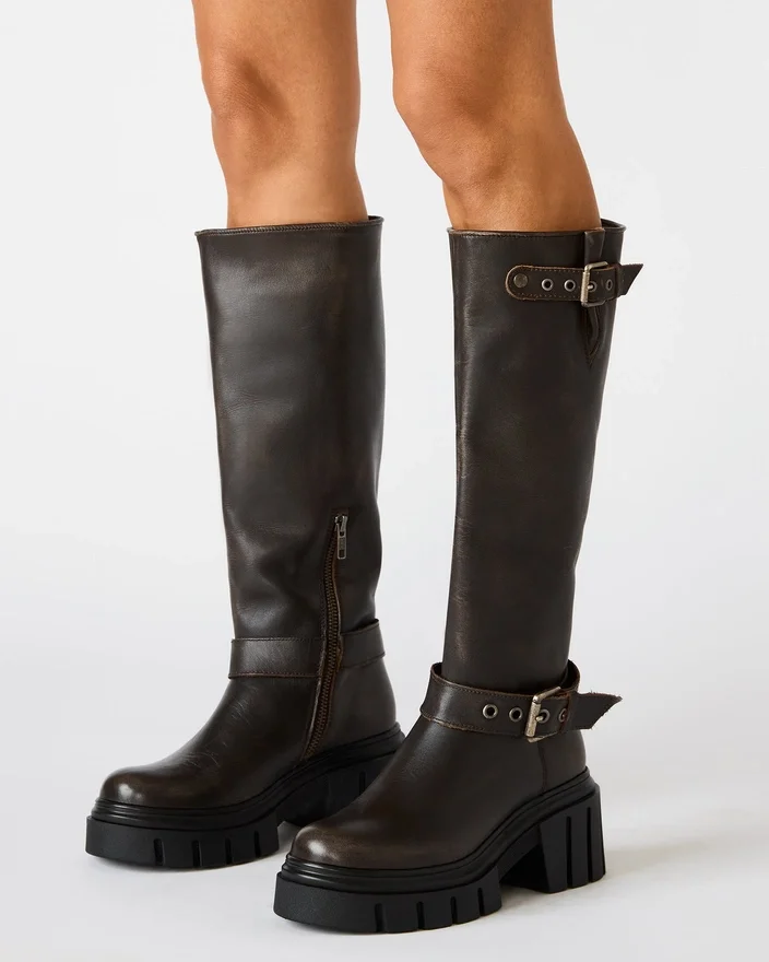 Disse Brigade-støvletterne har et unikt motorsykkeldesign og spennedetaljer, noe som gjør dem til et stilig valg til ethvert antrekk. Med en knelengde og grov mønstret såle kombinerer disse støvletterne mote og funksjonalitet. Det perfekte tilskuddet til enhver garderobe for et trendy og dristig utseende.