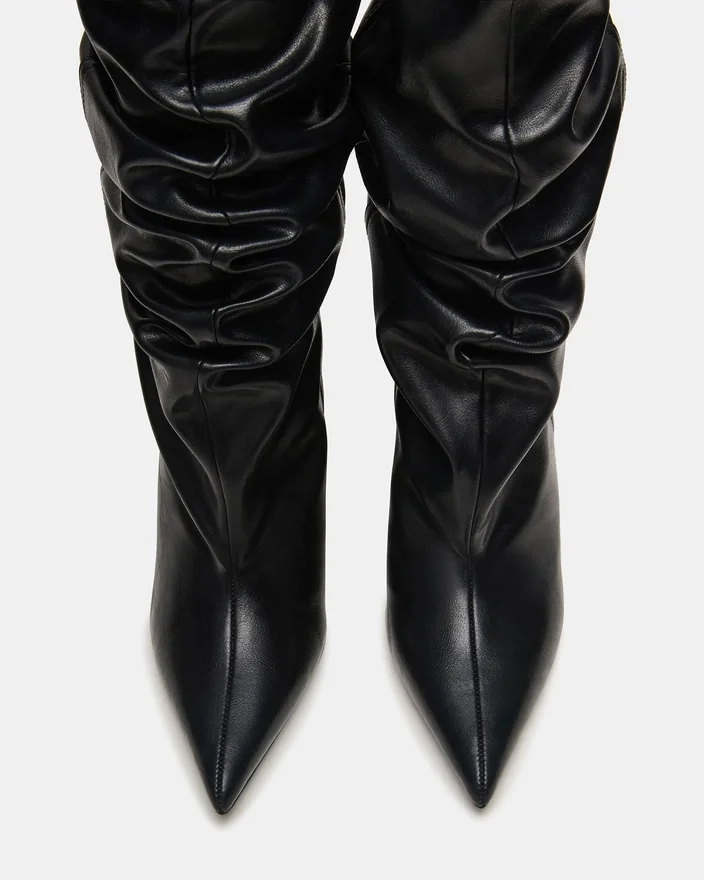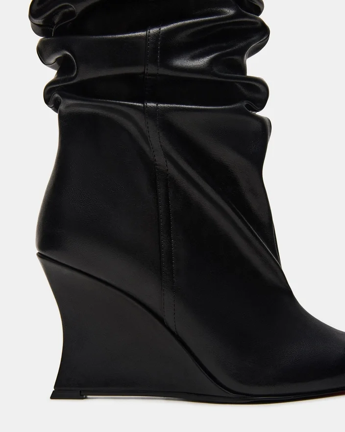 Distortion-støvlen har et krøllet design, kilehæl og spiss tå, og strekker seg til knehøyde for en dristig, moteriktig silhuett. Denne støvlen er laget for å kombinere edgy stil med komfort, og løfter ethvert antrekk med sitt elegante design og karakteristiske kilehælstøtte. Ideell for de som søker et statement-plagg som balanserer trend og praktisk bruk.