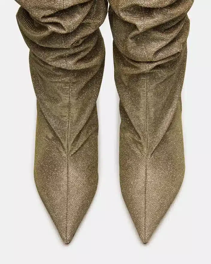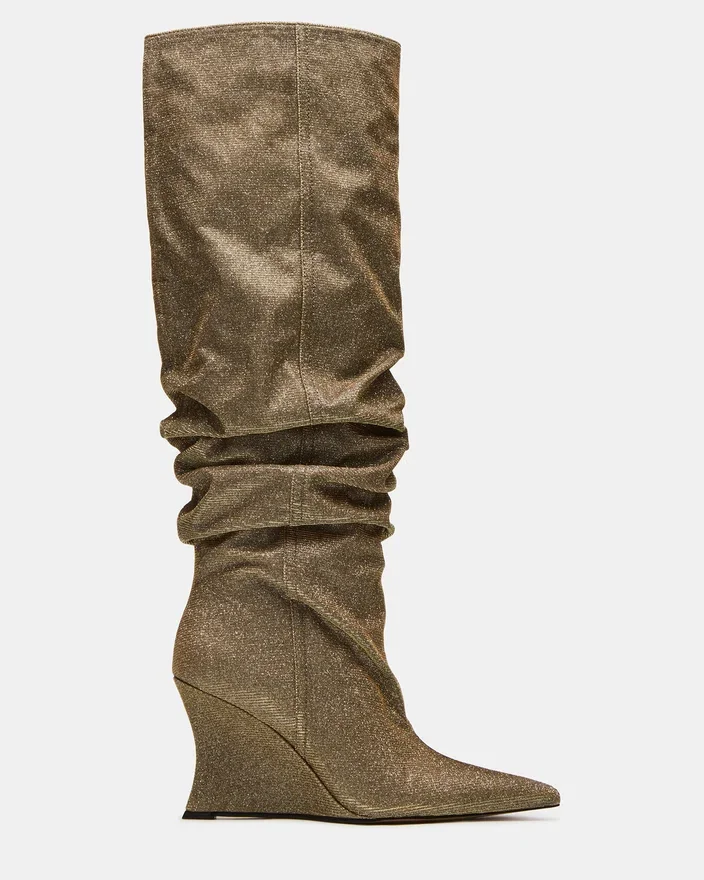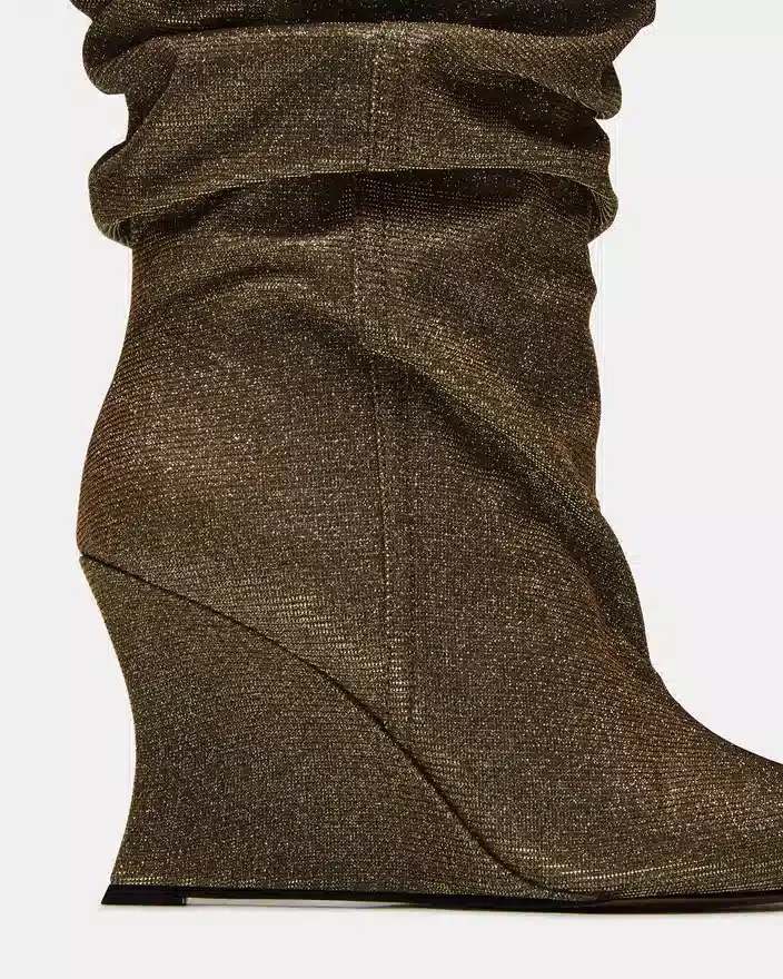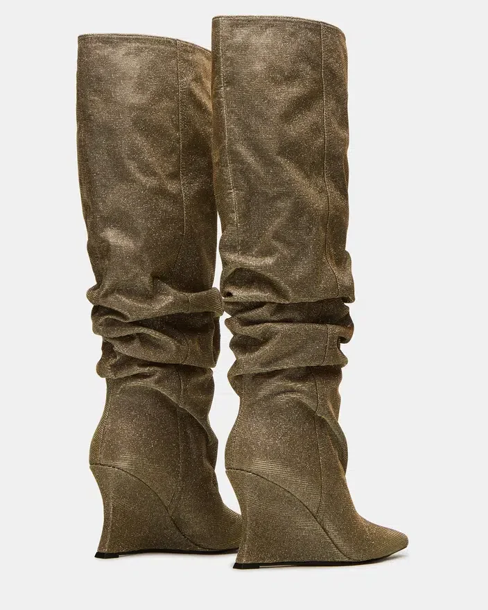 Distortion Gold Glitter-støvletten har et krøllet design, kilehæl og spiss tå, og strekker seg til knæhøyde for en dristig, moteriktig silhuett. Laget for å kombinere edgy stil med komfortabel passform, løfter denne støvletten ethvert antrekk med sitt elegante design og karakteristiske kilehælstøtte. Ideell for de som søker et statement-plagg som balanserer trend og praktisk bruk.