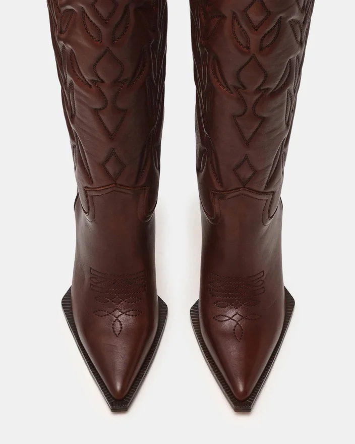 Kinzee brunt skinn gir Western-stil med et moderne preg. Denne knestøvelen har en skarp, spiss tå og en imponerende stilett-hæl som forlenger beinet. Laget av førsteklasses materialer, tilbyr denne modellen en elegant silhuett som enkelt kan kombineres med alt fra denim til kjoler for et uttrykksfullt resultat.