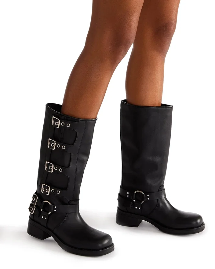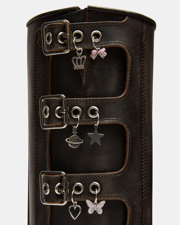Rocky Charms Brown Distressed Knee Støvletter har den brede profilen til en ingeniørstøvle, med seler og spenner som gir den et industrielt preg og gjør at designet kan tilpasses.