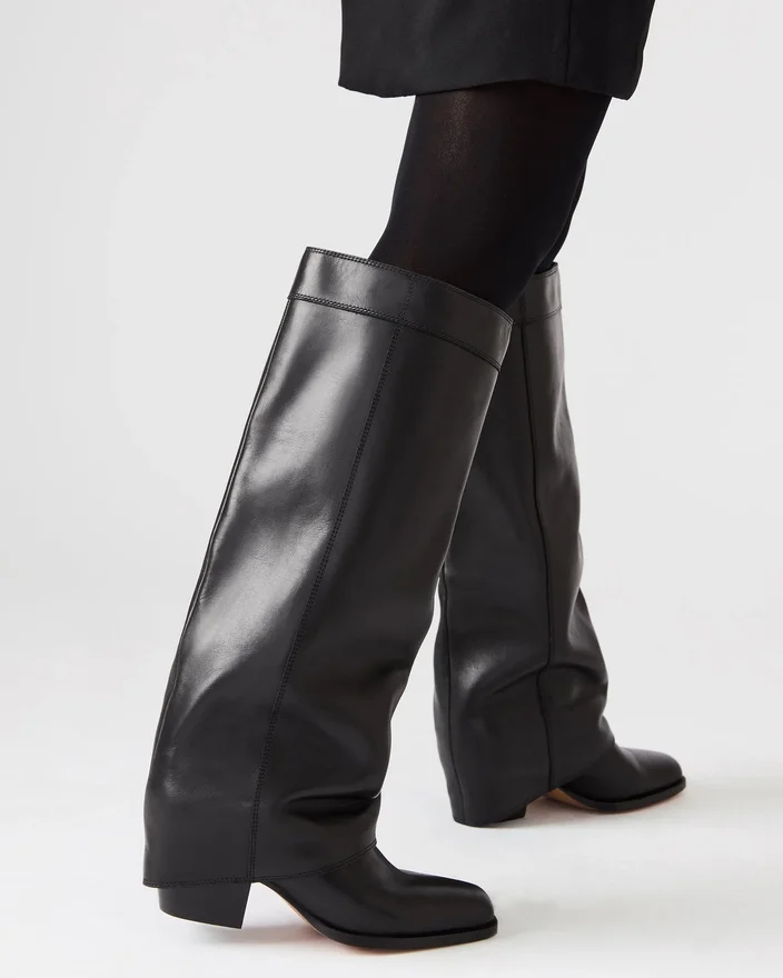 Oppgrader skosamlingen din med Winnick Olive Leather-støvletten, som har et sofistikert design med brettet kant som går opp til kneet for et markant utseende. Denne støvletten er laget med en moderne firkantet tå og støttes av en solid blokkhelt, og kombinerer stil med stabilitet, noe som gjør den ideell for bruk hele dagen.
