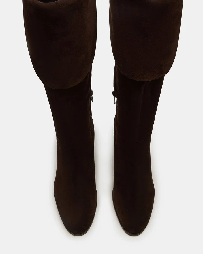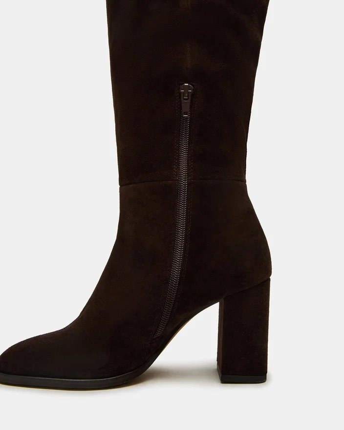 Winslet-støvlen i brunt semsket skinn har en knelengde silhuett med en solid blokkhæl, som gir både stil og stabilitet. Den avrundede tåen sikrer komfort ved langvarig bruk, noe som gjør den til et allsidig valg for å løfte garderoben din med et raffinert, profesjonelt preg. Denne støvlen kombinerer tidløs eleganse med praktisk funksjonalitet.