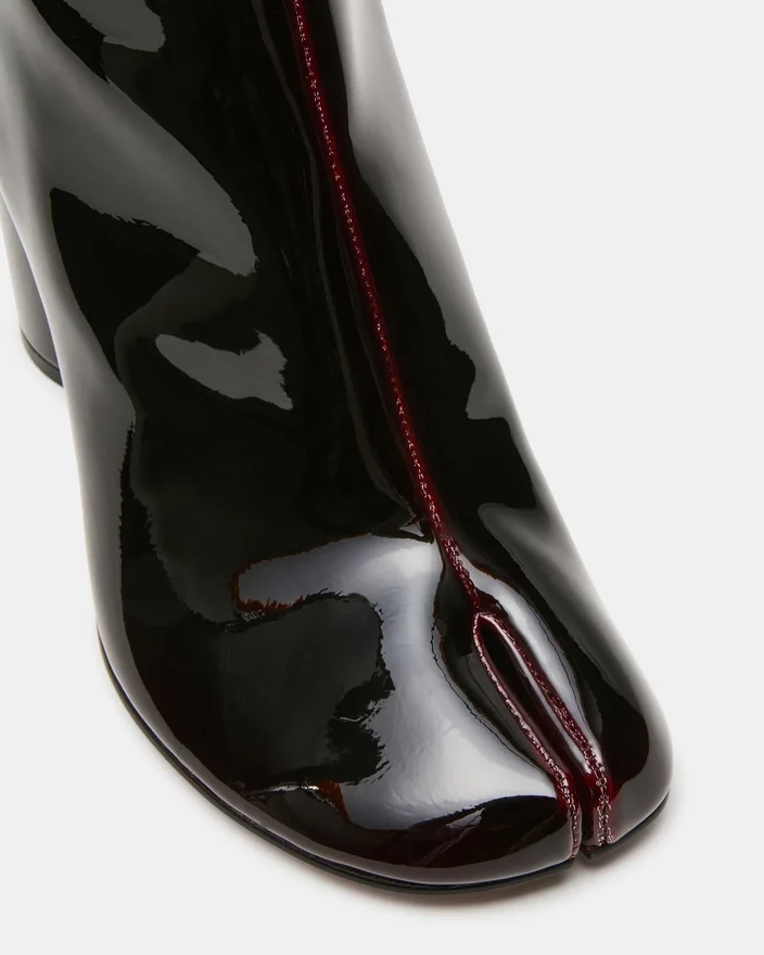 Caro Dark Cherry Patent har den karakteristiske Tabi-silhuetten med delt tå, og tilbyr en moderne estetikk med funksjonell komfort. En solid blokkhæl gir stabil støtte gjennom hele dagen, samtidig som den opprettholder et elegant utseende. Denne ankelstøvllen kombinerer sømløst elegant stil med allsidighet i hverdagen.