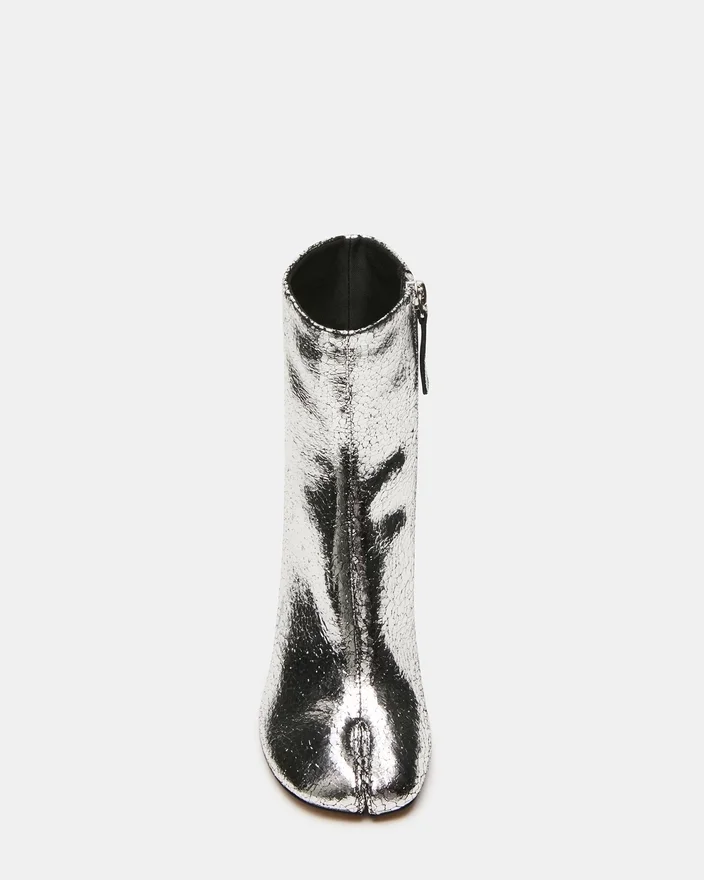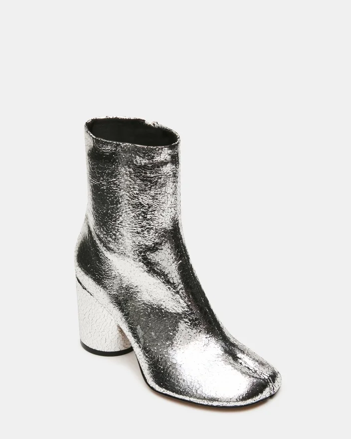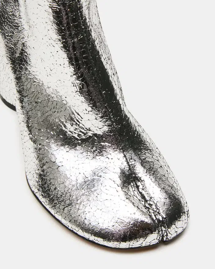 Caro Silver Crinkle har den karakteristiske Tabi-silhuetten med delt tå, og tilbyr en moderne estetikk med funksjonell komfort. En solid blokkhæl gir stabil støtte gjennom hele dagen, samtidig som den opprettholder et elegant profil. Denne ankelstøvllen kombinerer sømløst elegant stil med allsidighet i hverdagen.