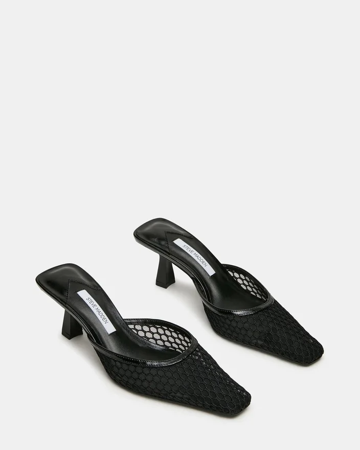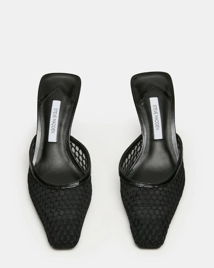 Alyse Black Mesh-muleskoen med firkantet tå gir diskret raffinement med sin raffinerte silhuett og lave hæl. Denne allsidige stilen går sømløst fra kontoret til kvelden, og tilbyr komforten til en slip-on-design uten å gå på kompromiss med elegansen. Den strukturerte firkantede tåen gir et moderne preg, mens den delikate hælhøyden sikrer at skoen kan brukes hele dagen.