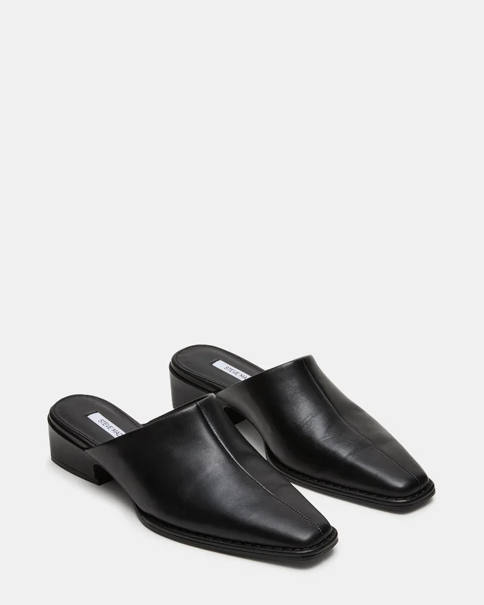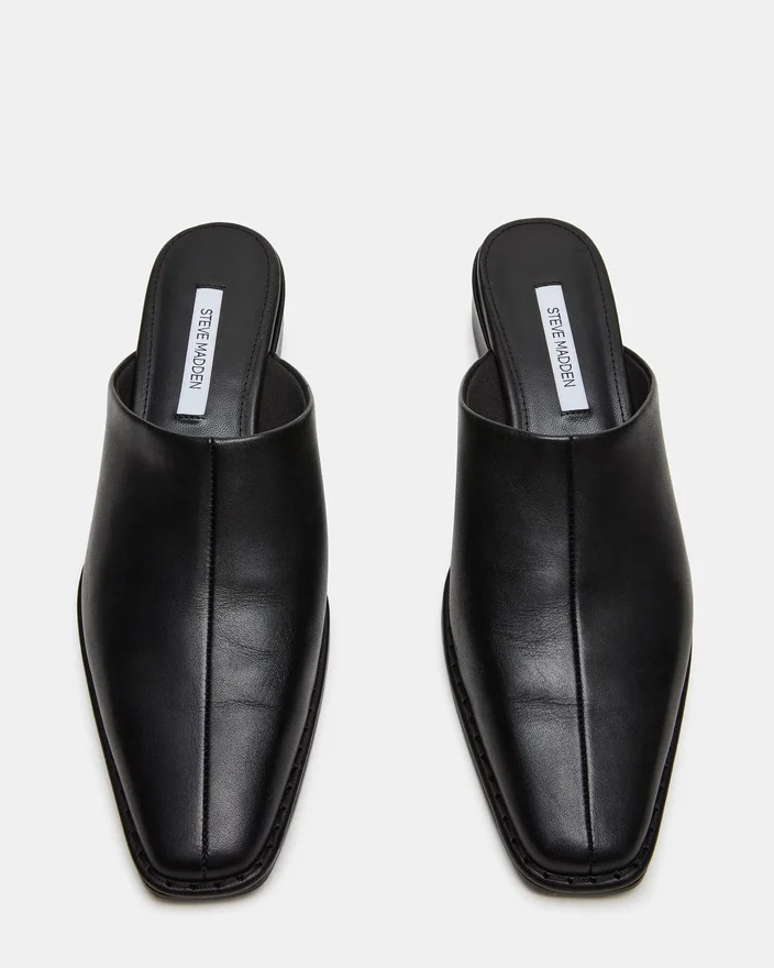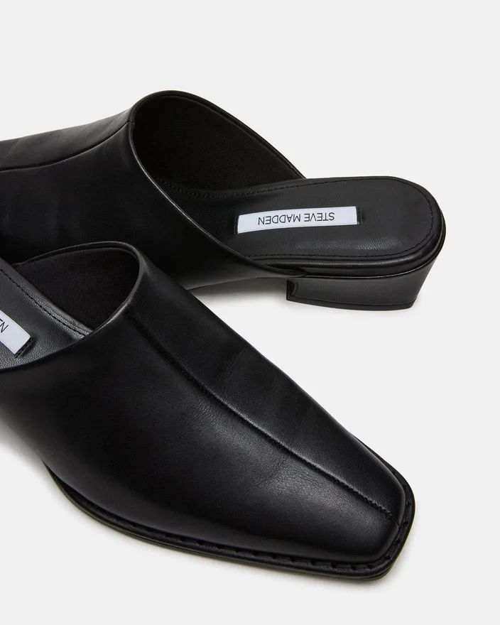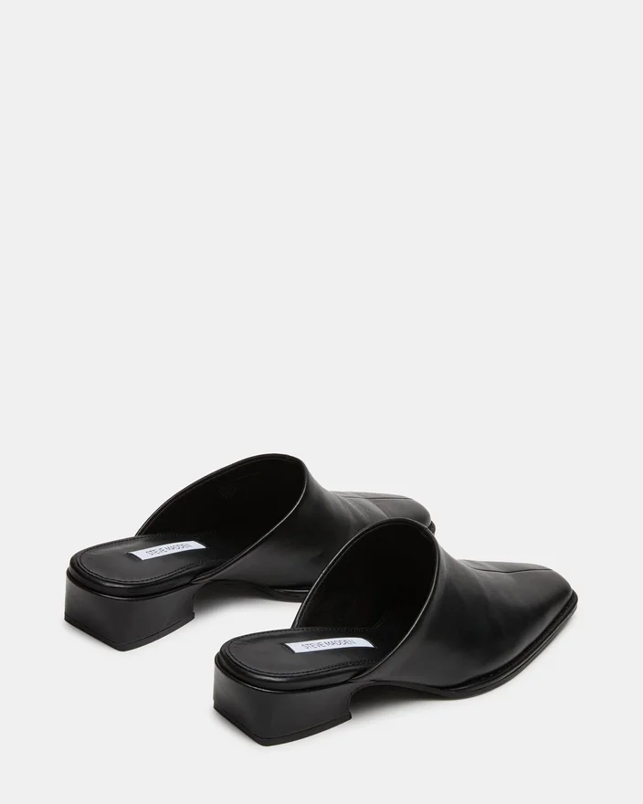 Dessa Black Leather Mule kombinerer diskret eleganse med praktisk komfort, og har en firkantet tå som smigrer foten samtidig som den opprettholder en moderne estetikk. Denne flate skoen gir pålitelig støtte og stabilitet, noe som gjør den egnet for bruk hele dagen eller til kveldsanledninger.