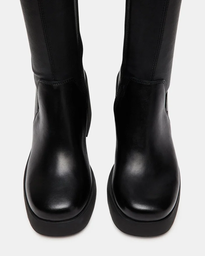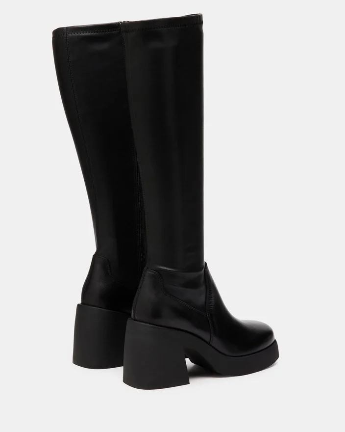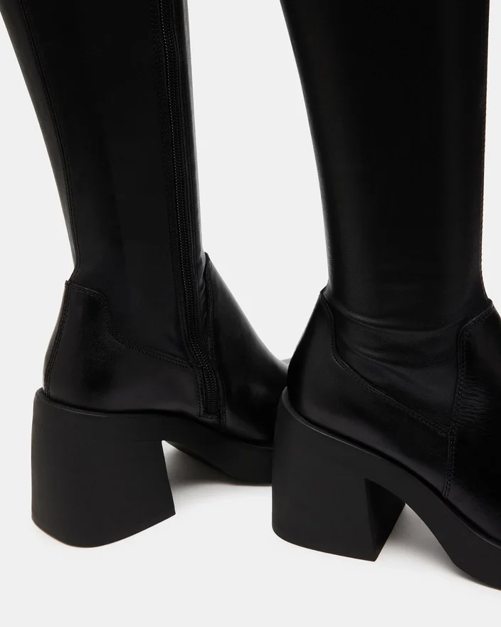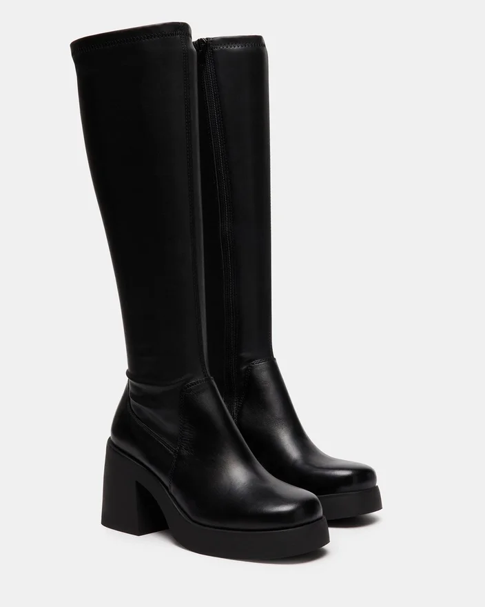 • Knelang støvel med firkantet tå, plattform og blokkheel