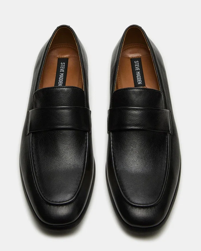 Biscuit Slip-On Dress Loafer er fagmessig laget av glatt svart skinn og utstråler eleganse og raffinement. Slip-on-designet gir bekvemmelighet og brukervennlighet, mens den slanke silhuetten tilfører et snev av raffinement. Løft arbeidsantrekket eller det formelle antrekket ditt med denne tidløse og komfortable skoen.