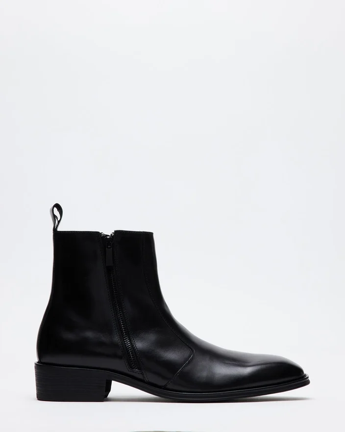 Et design med dobbel glidelås, blokkheler og en glatt front gir Haynes-støvletten et rent utseende og en skarp, definert silhuett.