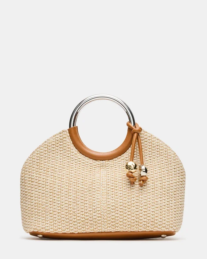 Geena Straw Bag Light Natural kombinerer sofistikert design med praktisk allsidighet. Denne strukturerte vesken med håndtak har et elegant ringhåndtak for raffinert bæring, supplert med iøynefallende perledetaljer på veskeanhenget. Den medfølgende avtakbare skulderremmen forvandler den fra en håndholdt stil til håndfri bruk, og tilpasser seg sømløst til din dag. En innvendig lomme på bakveggen gir sikker oppbevaring av nødvendigheter. Perfekt for å løfte ethvert antrekk samtidig som den oppfyller funksjonaliteten som dagens livsstil krever.