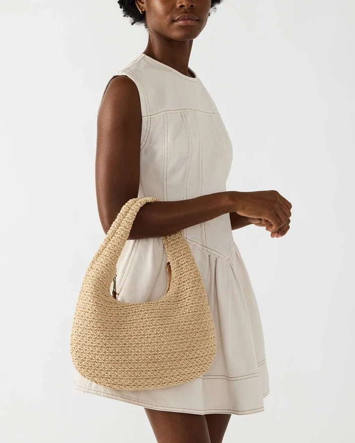 Opplev luftig mote med Daena Bag Natural. Denne halvmåneformede håndvesken er laget av naturlig strå og har en praktisk glidelåslukking øverst og er pyntet med et kvadratisk skjerf med knute og trykk. Hold stilen og ordenen mens du er på farten!