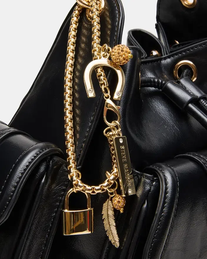 Dru Bag Black kombinerer strukturert eleganse med bohemsk stil. Denne vesken i bøtteform har en praktisk lomme med klaff foran og en justerbar kjederem for allsidig bruk. Det som skiller seg ut er utvalget av avtakbare boho-smykker – hestesko, fjær og hengelås – som lar deg tilpasse utseendet og uttrykke din personlige stil.